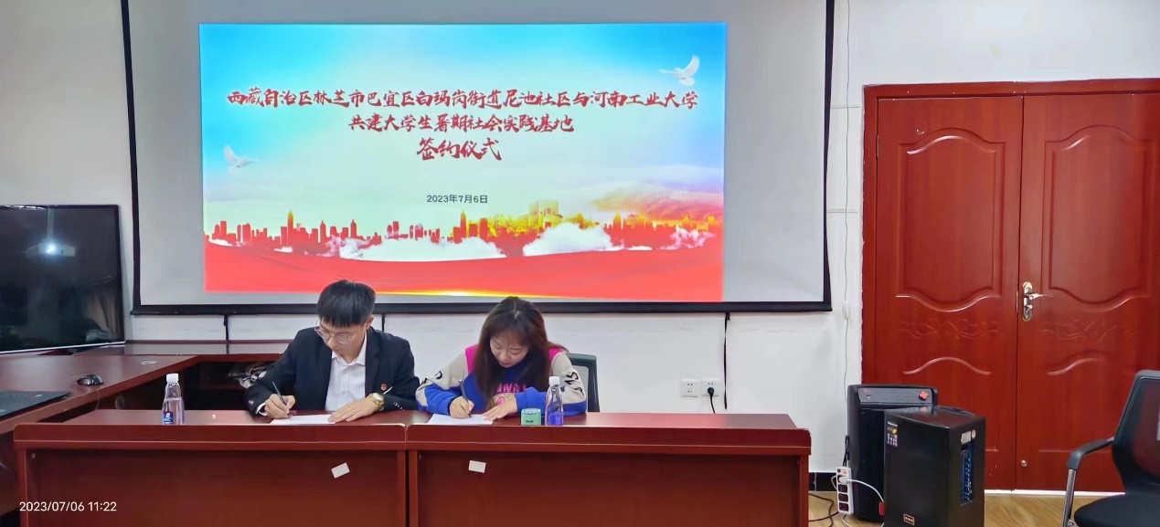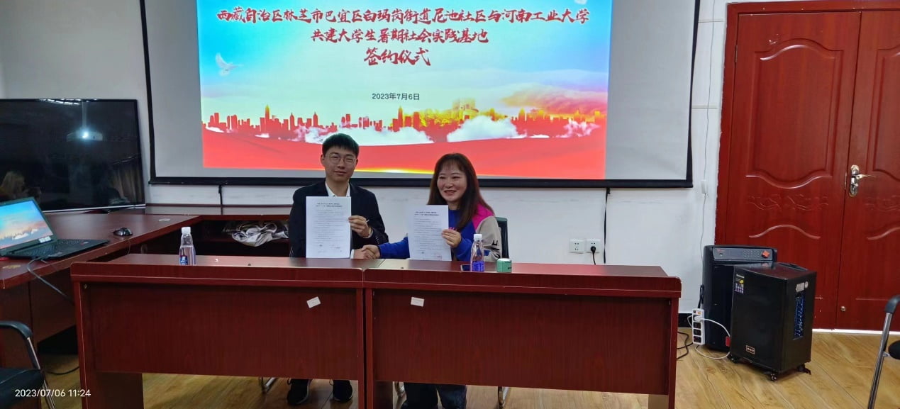 本網7月6日電(通訊員:秦夢杰 符策吉)2023年7月6日,河南工業大學與西藏自治區林芝市巴宜區白馬崗村街道尼池社區達成社會實踐基地合作的簽約儀式在巴宜區白瑪崗街道辦事處尼池社區退役軍人服務站舉行。尼池社區駐村第一書記譚利、社區工作人員,河南工業大學“鄭在林芝 愛在工布”赴西藏社會實踐團隊的全體成員出席簽約儀式。