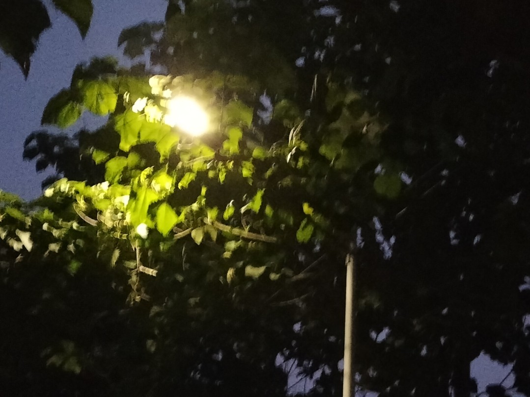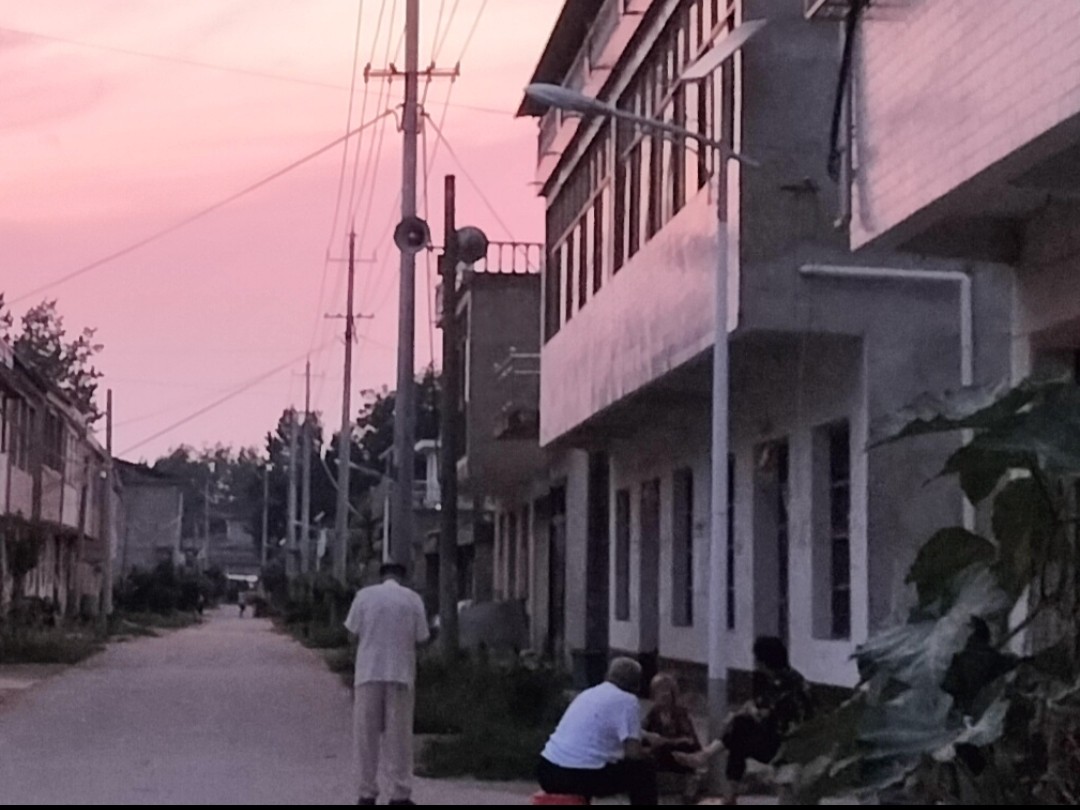 圖為實踐隊員在晚上19:40拍攝村民在路燈邊上聊天,路燈不亮晚霞明。通訊員 褚艷雨 攝