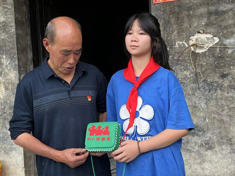 圖為紅軍村孩子為何少華同志送上親手制作的紅軍包(重慶外語外事學院李溢洋 攝)