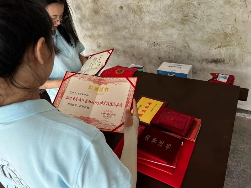 圖為實踐團成員觀摩何少華同志的榮譽證書(重慶外語外事學院李溢洋 攝)