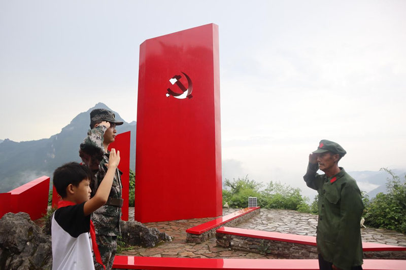 聽完王貴興老兵過去的故事,實踐團成員李溢洋同學帶著紅軍村二小的小朋友楊應一起向他敬禮,而他也進行了回禮。在黨徽下,他們眼神堅定的望著彼此,這是老兵與新兵的對望,是一種堅守和熱愛的傳承,是撒在小朋友心中的一顆紅色種子,是綻放在高山之上的軍中綠花。