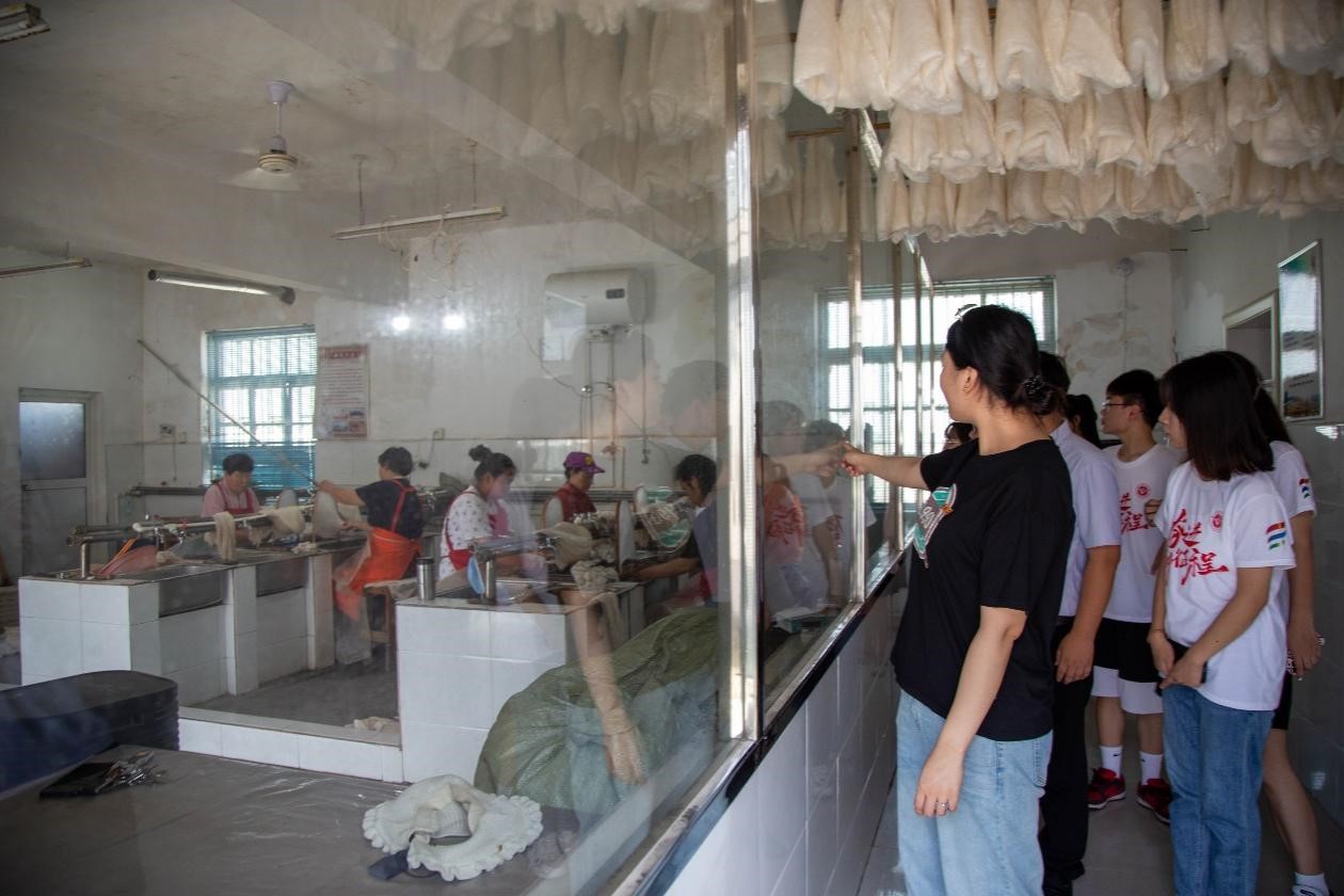 徐州市桑蠶文化博物館。成員們在講解員的帶領(lǐng)下了解了桑蠶的起源、發(fā)展以及其對農(nóng)耕文明的貢獻(xiàn)。“細(xì)細(xì)絲來圓圓繭,工人手中拉成線”,工作人員介紹了蠶絲制作工藝具體流程,從選繭、煮繭、剝繭到開棉,一一為實踐團成員講解其中的奧秘。在這里,成員們不僅感受到了生命的神奇和古人的智慧,還深深體會到農(nóng)業(yè)發(fā)展對當(dāng)?shù)剜l(xiāng)村經(jīng)濟發(fā)展的推動力。