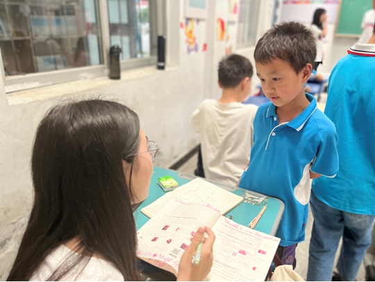 此圖為隊(duì)員蘇拉拉為小孩解疑(通訊員 廉博雅 攝)