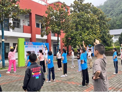 2023年7月3日早晨,志愿者們在茅塔鄉中心小學與孩子們共同練舞