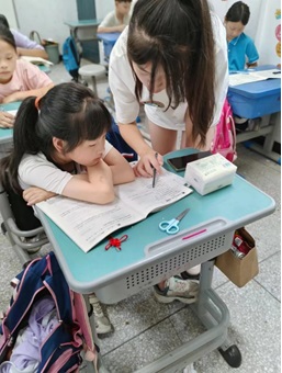 圖為志愿者老師在美術課上與孩子們一齊創作作品。(廖垣檣 攝)