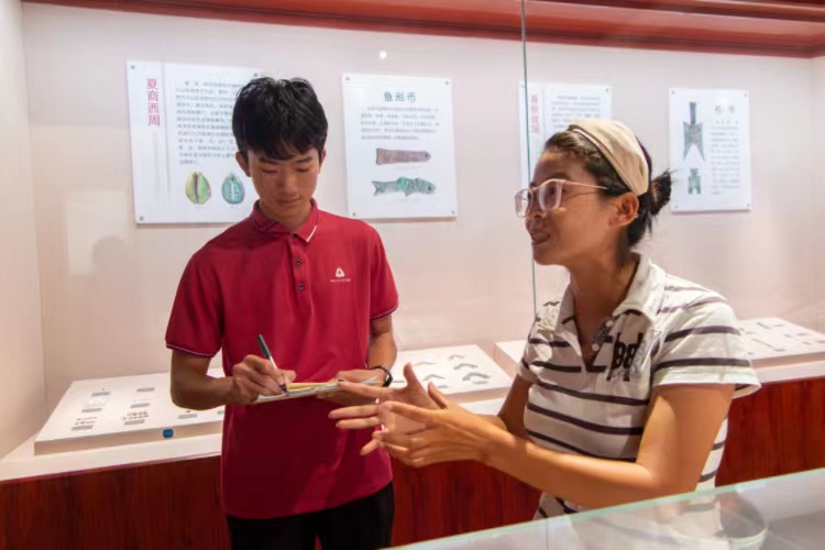 圖為實踐隊隊員與東營歷史博物館講解員交流 任鑫 攝