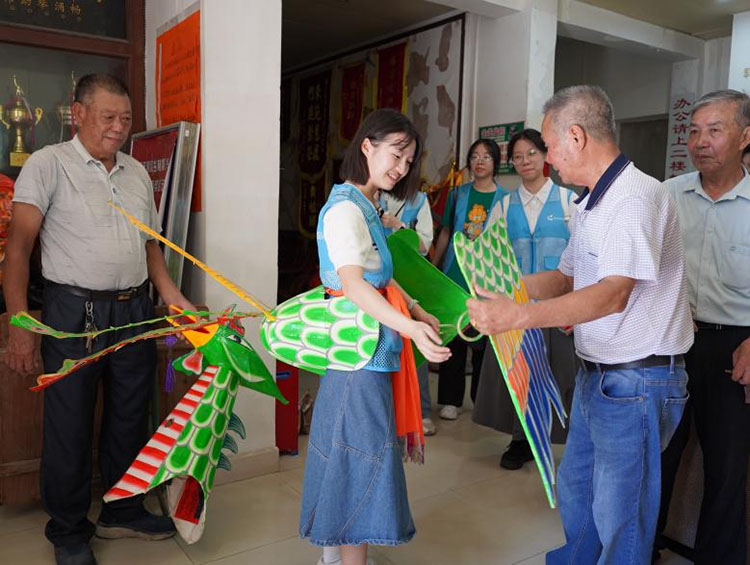 同時,實踐團深入古城街巷,在東門理事會拜訪了“鳳舞”傳承人黃廣河。在與實踐團的交流中,他親切細致地闡述了“鳳舞”藝術的起源與發展脈絡,同時提出了“鳳舞”表演傳承與創新的新思路:“現在的舞臺很大,五條鳳站在上面略顯單調,所以我們設想放十條鳳,增添部分新角色,把場面撐起來。”此外,他還特別強調了中年婦女在鳳舞傳承中的重要作用:“我們鼓勵并邀請中年婦女加入鳳舞表演隊伍,她們不僅學習能力強,且長期扎根于村落,能夠將所學技藝傳至下一代。”實踐隊還了解到,黃廣河正嘗試與平海附近的幼兒園進行合作,將“鳳舞”表演內容通過幼師傳授給兒童,以此擴大“鳳舞”這一非遺文化教學與傳承的規模。