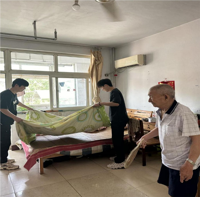 實踐團成員為老人鋪床