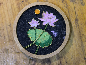 掐絲琺瑯,作為一種精湛的工藝,通過在金屬表面填充彩色玻璃絲,再經過高溫燒制而成。這種技藝要求匠人在每一步驟中保持極高的技術水平和審美標準,從而創造出富有光澤和立體感的藝術品。掐絲琺瑯不僅在珠寶和工藝品領域有廣泛應用,還被廣泛運用于宗教和文化場合,體現了人們對精美和卓越工藝的追求。一名小組成員選擇畫荷花與荷葉,通過花費了大量的耐心以及精力,最后成功的完成了一個十分優美的掐絲琺瑯。