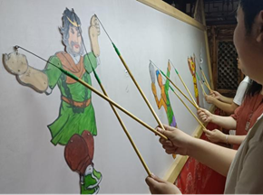 皮影,作為中國古老的傳統戲劇形式,通過在半透明的皮紙上剪出各種人物形象,并在燈光的照射下進行表演。這種技藝不僅在藝術表現上具備獨特的戲劇性和視覺效果,還承載著中國豐富的文化內涵和傳統價值。如今,皮影不僅在中國國內得到保護和傳承,還逐漸受到國際社會的重視和歡迎,成為文化交流的重要橋梁和文化遺產的重要代表之一。小組成員們通過親自上手體驗,感受到了來自皮影的樂趣以及其蘊含的中華傳統文化。