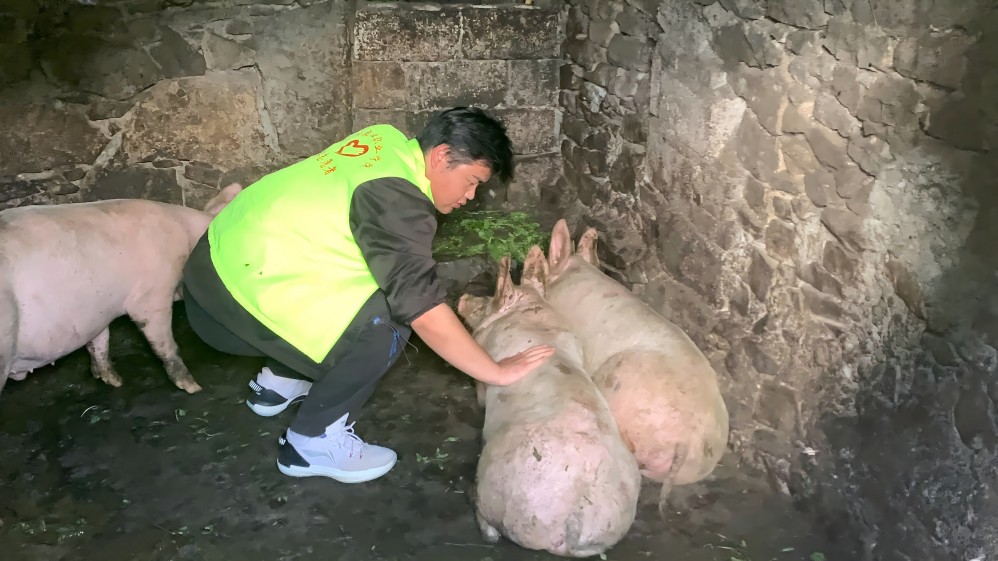 圖為促進(jìn)團(tuán)成員為養(yǎng)殖戶們發(fā)放養(yǎng)殖技術(shù)手冊(cè)和消毒粉等物資 龍飄 供圖促進(jìn)團(tuán)成員還前往村民家中去幫他檢查他家豬不吃食的情況。促進(jìn)團(tuán)成員仔細(xì)觀察豬的狀態(tài),檢查環(huán)境和飼料,憑借專(zhuān)業(yè)知識(shí)為村民分析原因并提供有效解決建議。