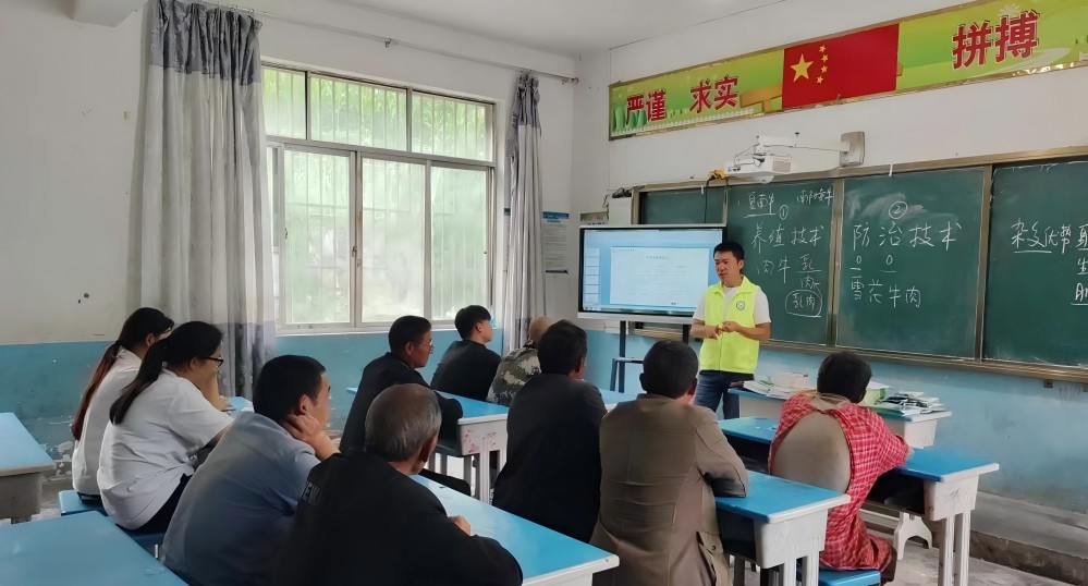 圖為培訓(xùn)結(jié)束后促進(jìn)團(tuán)成員與養(yǎng)殖戶們的合影“知行合一青春篤行”鄉(xiāng)村振興促進(jìn)團(tuán)的指導(dǎo)老師薛森武圍繞肉牛養(yǎng)殖和疫病防治兩大主題,展開(kāi)了深入細(xì)致且通俗易懂的講解。在肉牛養(yǎng)殖方面,薛老師就品種選育、飼養(yǎng)管理、繁殖技術(shù)等關(guān)鍵環(huán)節(jié)進(jìn)行了詳細(xì)闡述,并分享了許多實(shí)用的養(yǎng)殖技巧和經(jīng)驗(yàn)。針對(duì)疫病防治,他還強(qiáng)調(diào)了預(yù)防的重要性,介紹了常見(jiàn)疫病的特點(diǎn)、傳播途徑和有效防控方法,使養(yǎng)殖戶們對(duì)疫病有了更清晰的認(rèn)識(shí)和更有效的應(yīng)對(duì)策略。