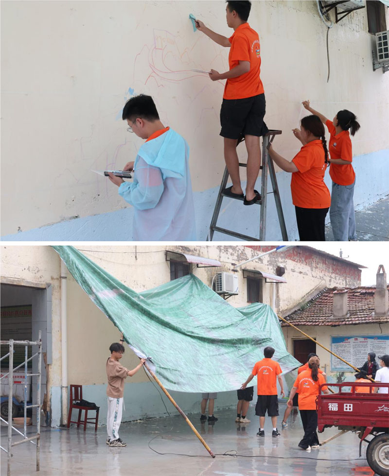 然而,在繪畫過程中,白水縣連續降雨,給繪制工作帶來了極大的挑戰。但村民們的熱情支持成為了實踐團前進的動力與保障,他們主動為實踐團成員搭建雨棚,為繪制工作創造了有利條件。實踐團成員們也毫不懈怠,身著雨衣,團結協作,在雨中連續作畫,始終保持著較高的工作效率。