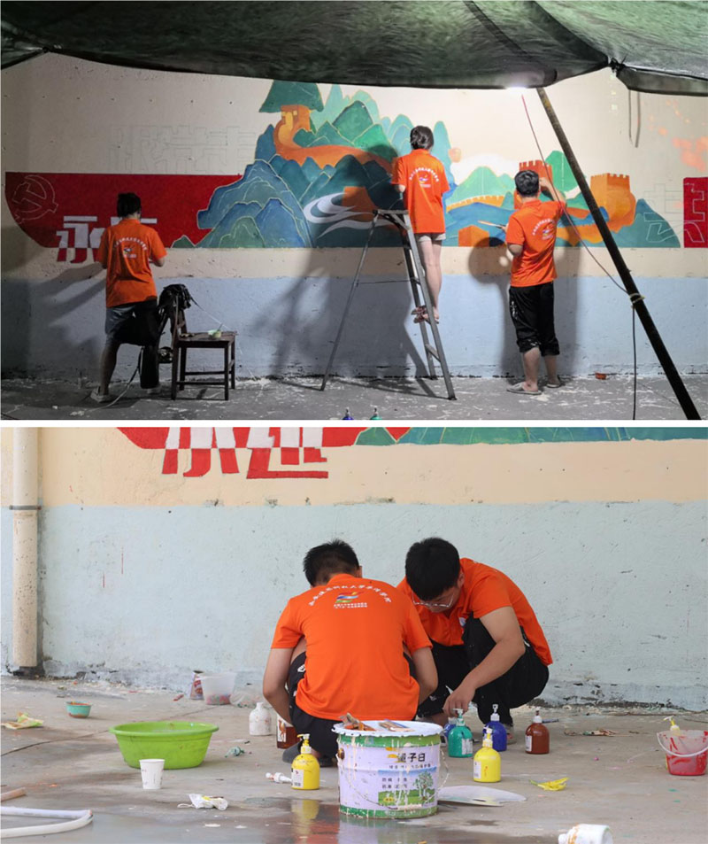 此次實踐團創作的墻體繪畫主題為“永遠跟黨走,共筑中國夢”。在構思上,畫面上方精心展現了祖國的大好河山與雄偉壯觀的萬里長城,通過藝術的筆觸傳遞出對黨和國家的熱愛,以及對偉大中國夢的追求。