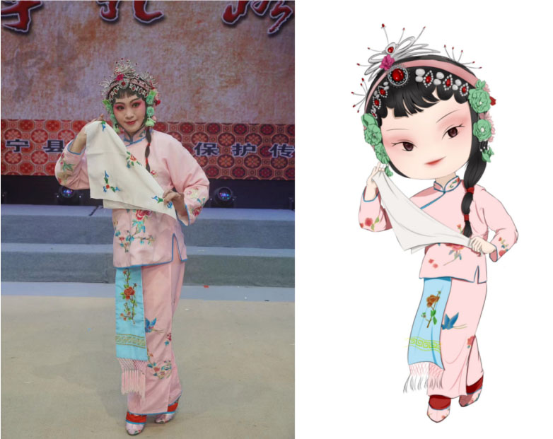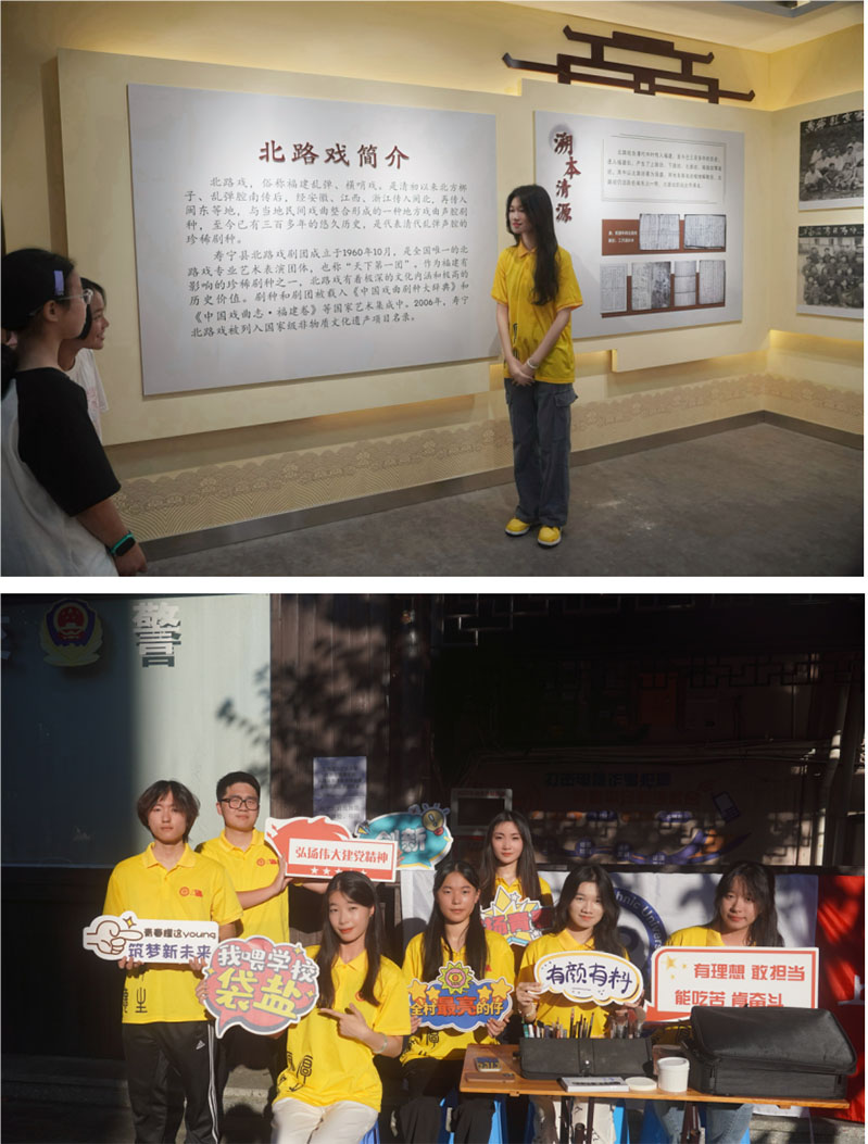 為進(jìn)一步推動(dòng)北路戲傳播與交流,實(shí)踐隊(duì)與壽寧縣北路戲保護(hù)傳承中心開(kāi)展合作,現(xiàn)場(chǎng)直播2024年福建省地方(瀕危)劇種公益性演出,通過(guò)北路戲經(jīng)典劇目《掛畫》、《天女散花》、《武術(shù)精萃》,和現(xiàn)代創(chuàng)新劇目《鸞峰橋》的演繹,傳播北路戲非遺文化的獨(dú)特魅力,極大提升了北路戲曲藝術(shù)的影響力。實(shí)踐隊(duì)走上街頭開(kāi)展了“壽寧北路戲妝造免費(fèi)體驗(yàn)”志愿活動(dòng),吸引在場(chǎng)觀眾體驗(yàn)北路戲妝造,并宣講北路戲的歷史和妝容特點(diǎn)。實(shí)踐隊(duì)擔(dān)任馮夢(mèng)龍紀(jì)念館和北路戲紀(jì)念館展館的講解志愿者,提供講解服務(wù)。實(shí)踐隊(duì)也從卡通IP形象入手,通過(guò)設(shè)計(jì)北路戲的卡通形象,增加其傳播方式。