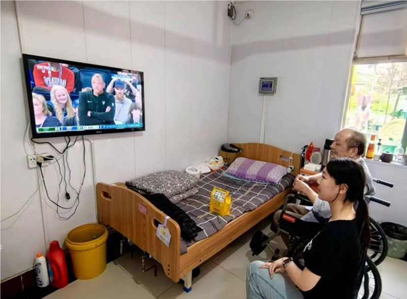 實踐團成員劉宇涵陪老人一起觀看電視