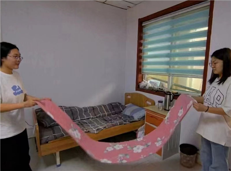 實踐團成員徐長燕、劉欣悅為老人整理床鋪