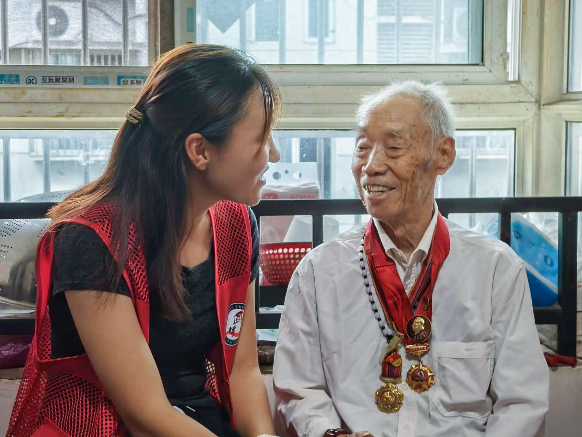 此外,為深入探索紅色文化精髓并深刻體會革命歷史的厚重,志愿者們專程拜訪社區內兩位退伍的老兵——駱騰平和周元德。駱騰平曾投身于祖國核導彈事業,由于核導彈輻射,身患多種疾病,但他卻無怨無悔,展現了軍人的擔當與奉獻。他告訴志愿者:“我在年輕有精力的時候,國家需要我,我就沖在前線。” 志愿者前往拜訪94歲的周元德時,他早已身著白襯衫,掛好榮譽勛章,正襟危坐于窗邊,等待志愿者的到來。作為抗美援朝戰爭的親歷者,他講述了戰場上的艱苦歲月與生死考驗。“我是1953年6月入伍,12月就上了抗美援朝戰爭的戰場。那時沒時間練新兵,只能三個老兵帶一個新兵,俗話說:‘老兵怕機槍,新兵怕大炮。’我也怕,不怕是不可能的,但我很幸運的活下來了。”他回憶,“戰場上條件很艱苦,雨水很多,有時候干糧也會被雨水打濕沒辦法吃,會餓肚子好幾天。”采訪結束之際,志愿者問他:“你退伍回來時,最想做什么呢?”他沉思良久后說:“我沒什么想要的,只想在國家需要我的時候我能出一份力。” 這份對國家深沉的愛與責任令人動容。