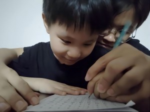 圖為實踐隊員在宣講后教村中小朋友練習規范字