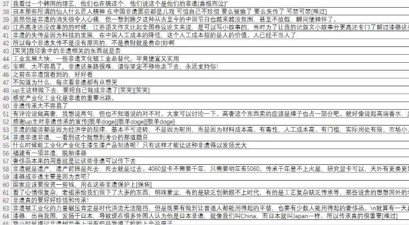 我們選擇了b站上一名知名非遺up主(南翔……)的非遺傳承視頻爬取評論,經(jīng)過一段時間的努力,爬蟲程序成功獲取了大量的數(shù)據(jù)。