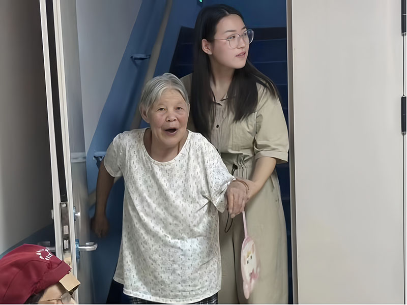 實踐團成員注意到有老人下樓上樓腿腳行動不便,實踐團成員便扶著老人從樓上走下來,確保與老人步伐相一致,時刻觀察著老人的身體狀況,老人享受貼心服務的同時,臉上露出欣慰的笑容,整個房間縈繞著溫馨的氣氛,老人的臉上洋溢的笑容也讓實踐團成員心里暖洋洋的。