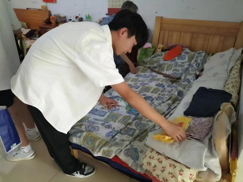 清晨,志愿者們早早地來到養老院的臥室,開始為老人們疊被子。他們按照統一的標準和要求,仔細地整理床鋪,確保每個被子都疊得整整齊齊、美觀大方。同時,他們還幫助老人挪動床位、整理衣物,盡量讓老人們感受到家的溫馨與舒適。