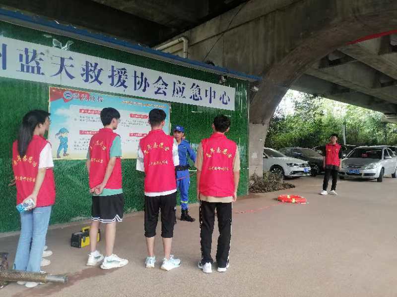 我們又來到外邊場地由隊長向我們展示了向落水者拋繩索施救的方法與注意事項,首先要將繩索的一頭與救生圈打結(打結的手法也有一定的要求,確保牢固),然后將另一頭放在手中握好,再向遠處拋出。最后,收繩索的過程也有講究為了確保在下次使用時不會打結。
