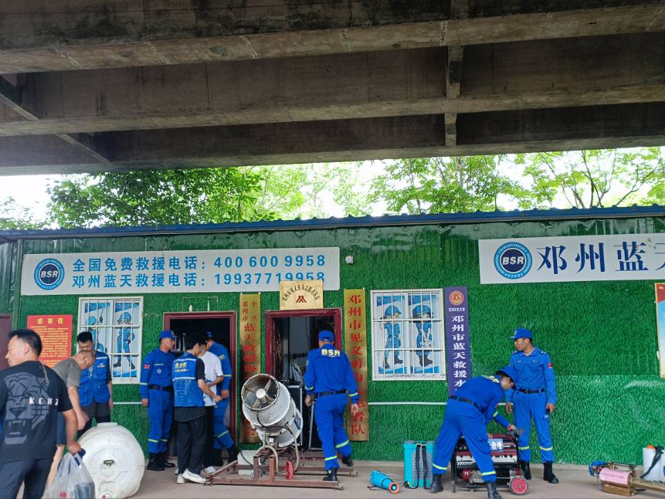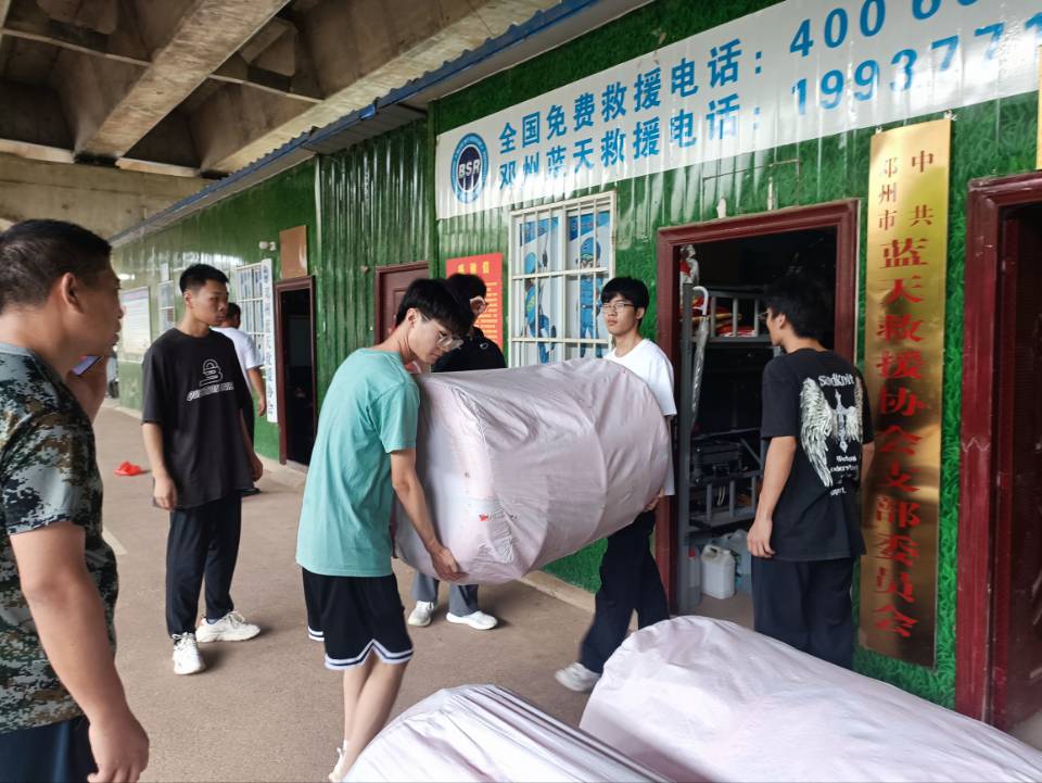 到達時正遇在洞庭湖決堤,鄧州市藍天救援隊接收上級指令前往平江縣展開救援慰問的出征儀式。在我們暑期實踐組到達后,首先為救援隊的救援儀器設備的準備與搬運出一份薄力。(下圖是組員搬運器材的場景)