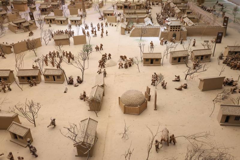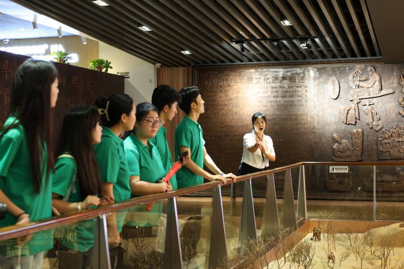 咸陽市群藝館內現存的“非遺咸陽”泥塑沙盤是國內最大的民俗類場景泥塑群雕,以地理為標尺,容納了咸陽市屬的13個市、縣、區近70個重點非遺項目,人物造型惟妙惟肖,盡顯咸陽文化的厚重深遠和傳統技藝的非凡魅力。從“秦瓊敬德門神傳說”到“弦板腔”、“三原老龍”;從“咸陽茯茶制作技藝”到“彬縣燈山會”,跟隨著群藝館工作人員的講解,實踐團成員們在這里觀察到保存完好的千余件咸陽地區非遺展品,每一件展品、每一種技藝都承載著深厚的歷史底蘊和文化內涵。通過這些展品,成員們也對咸陽當地的歷史及非遺文化有了更深層次的了解。實踐團成員鄧璐感嘆道:“即便我生活在咸陽,但是這種獨特的展示方式,仿佛將咸陽各地的風土人情濃縮在我的眼前,使我對這片土地的多元文化有了更加清晰的認知。”