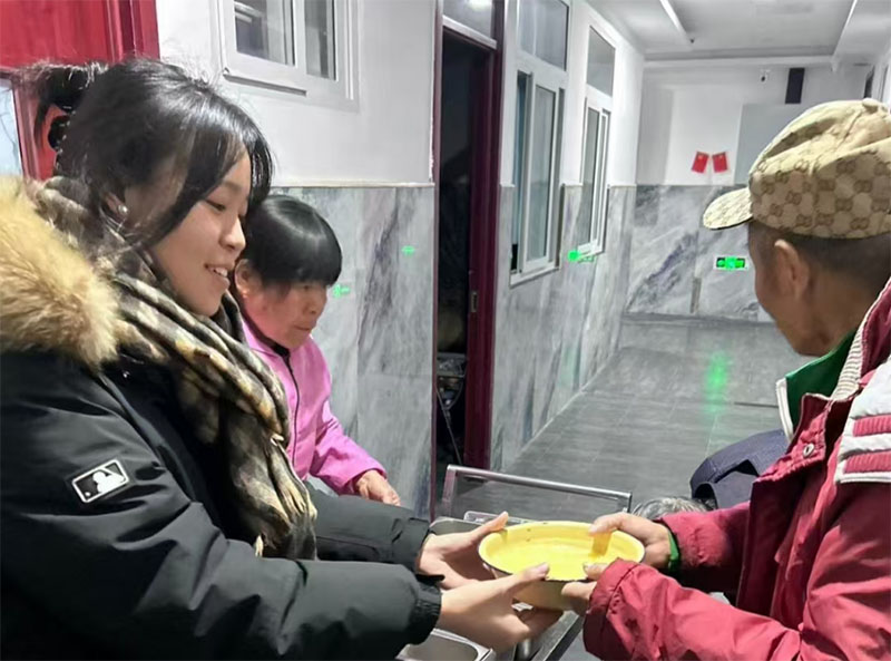 實踐團成員面帶溫和的笑容,雙手小心翼翼地捧著一碗飯菜,那飯菜還冒著騰騰的熱氣,正遞給一位老人,老人專注地看著即將到手的飯菜。旁邊還有其他實踐成員也在井然有序地忙碌著,有的在準備飯菜,有的在協助分發,整個場景充滿了溫暖與關懷,實踐團成員用實際行動為老人們送去了貼心的幫助和照顧,讓老人們在這個環境中感受到了滿滿的愛意與溫暖。
