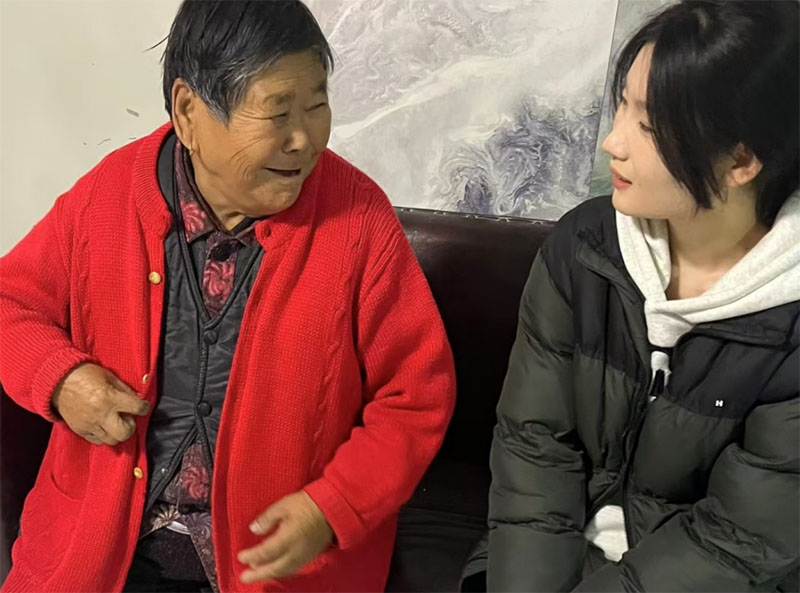 實踐團成員坐在老人身旁,姿態放松且專注,他們微微前傾身體,目光溫和地注視著老人,以輕柔的語調開啟話題。老人坐在沙發上,背部微微靠向椅背,側過臉龐,認真傾聽著實踐團成員的話語,隨后緩緩開口回應,講述著過往的點滴。實踐團成員不時點頭,偶爾提出新的問題,一來一往間,交流自然而順暢,現場氛圍溫馨而寧靜。
