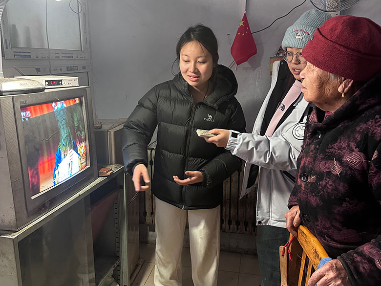 圖為實踐團成員耿亞榮和趙雪晴為老人講解電視調(diào)臺