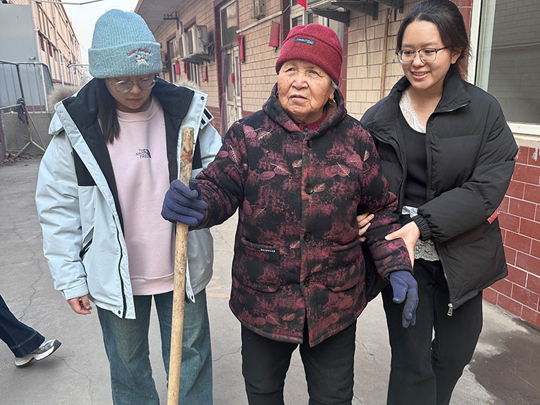 圖為實踐團成員陶文穎和趙雪晴陪老人散步