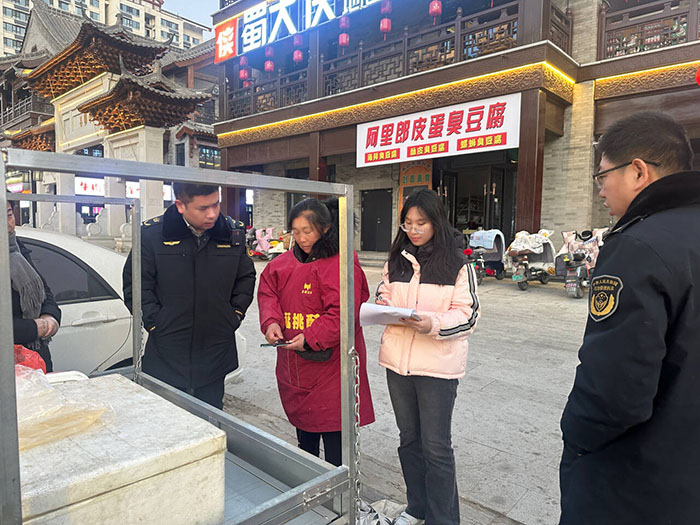 活動(dòng)首日,實(shí)踐團(tuán)成員跟著執(zhí)法人員一同前往小吃街,對(duì)街邊小吃攤點(diǎn)進(jìn)行檢查。他們仔細(xì)查看食材的儲(chǔ)存和衛(wèi)生情況,確保每個(gè)環(huán)節(jié)符合標(biāo)準(zhǔn)。面對(duì)“阿里郎皮蛋臭豆腐”攤位,執(zhí)法人員詳細(xì)檢查,攤主在一旁配合他們,雙方共同關(guān)注食品安全問(wèn)題。