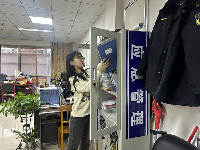圖為實(shí)踐團(tuán)成員王雨萌將重要文件整理好放入柜中