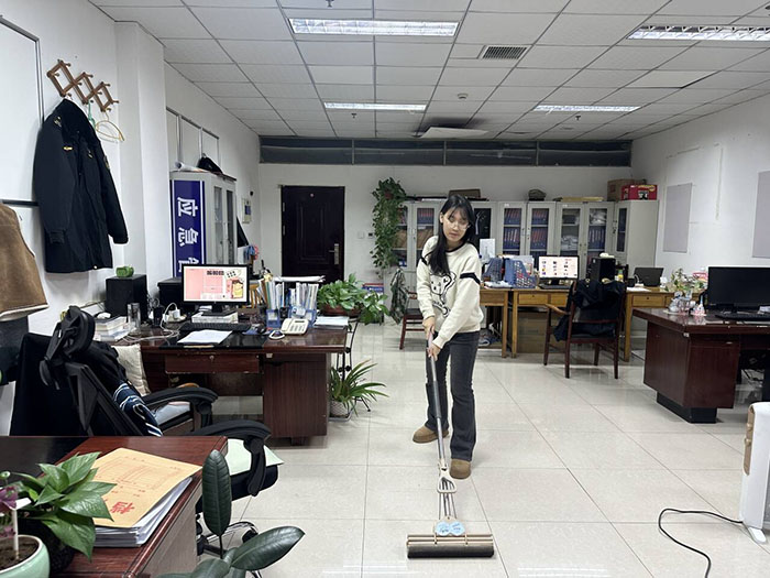 圖為實(shí)踐團(tuán)成員王雨萌在工作結(jié)束后打掃衛(wèi)生