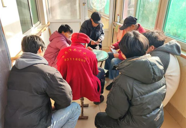 此圖為“夕陽信使”實踐團王玉琥、張景昊、李永生一起陪老人們聊夠級打牌