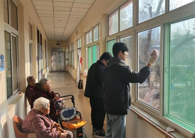 活動當天,實踐團成員們早早來到養老院,稍作準備后便迅速投入到各項服務中。一部分成員主動承擔起打掃衛生的工作,他們認真擦拭著養老院的每一扇窗戶,打掃著每一個角落,將公共區域和老人們的房間都收拾得干凈整潔,為老人們營造了更加舒適的居住環境。