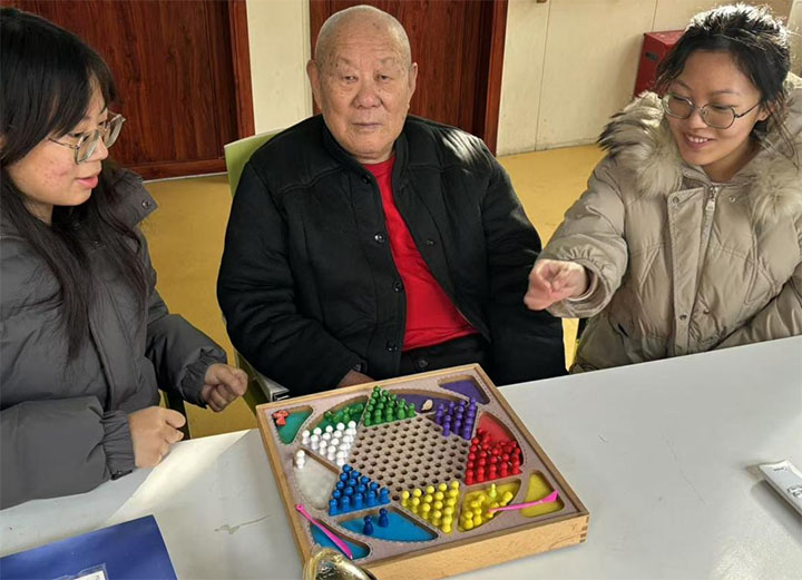 圖為“暖陽先鋒“實(shí)踐團(tuán)成員在與老人玩積木