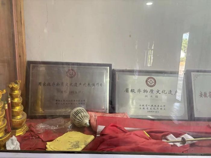 在周家村五猖館,國家級非遺傳承人、梅渚鎮五猖會會長周國平熱情接待了大家。他向我們介紹了關于五猖館的歷史由來:跳五猖又稱五猖會、跳菩薩,主要分布于宣城市郎溪縣梅渚鎮、南京市高淳區椏溪鎮、溧陽市社渚鎮一帶的胥河沿岸和馬鞍山市湖陽鎮大隴鎮等地,這一儀式起源于安徽廣德縣橫山,是皖蘇交界胥河兩岸古代村民對西漢張渤(民稱祠山大帝)開鑿長興荊溪河,引流至廣德的功績崇敬與緬懷而設,安徽郎溪縣周家村跳五猖列入國家級非物質文化遺產名錄。他向眾人展示了櫥柜里的服飾和面具,這些都是跳五猖表演的重要道具。其中,有著八九百年歷史的和尚神面具和“萬壽牌子”,引得眾人紛紛駐足觀看,對古人的精湛技藝贊嘆不已 。
