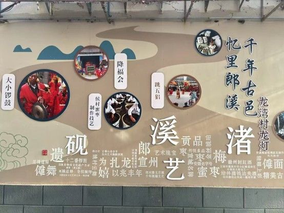 踏入一里巷,長約百米的“千年古邑 魅力非遺”文化墻率先映入眼簾,其以立體“文化圖鑒”之姿,鋪展郎溪非遺傳承脈絡。墻面上,姚村云舞追溯至明代,跳五猖將士們剛勁舞姿、神秘臉譜的符號;侯村蜜棗制作技藝里,大小鑼鼓傳承譜系。十余項非遺項目借由百組簡潔文字、兩百余張珍貴影像,勾勒出郎溪自東晉建縣以來,從農耕社會民俗濫觴到當代文化振興的完整文化肌理。