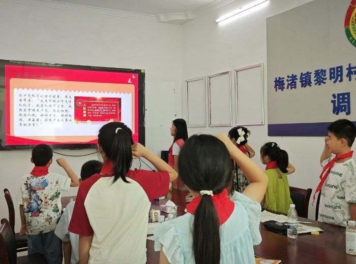 踐行立德樹(shù)人根本任務(wù),暑托班以 “童心向黨,強(qiáng)國(guó)筑夢(mèng)” 為主題開(kāi)展系列活動(dòng),將紅色基因傳承融入生動(dòng)實(shí)踐。團(tuán)隊(duì)成員通過(guò)圖文故事、互動(dòng)問(wèn)答,向孩子們講解黨的光輝歷程與使命擔(dān)當(dāng),讓大家明白 “少年強(qiáng)則國(guó)強(qiáng)” 的深刻意義。隨后,成員們手把手教孩子們系紅領(lǐng)巾,從整理衣角到穿插打結(jié),每一個(gè)步驟都耐心示范,直到孩子們胸前的紅領(lǐng)巾都系得整齊規(guī)范、鮮紅醒目。最后,全體學(xué)生在隊(duì)旗下莊嚴(yán)宣誓,稚嫩而堅(jiān)定的聲音回蕩在教室里,訴說(shuō)著 “請(qǐng)黨放心,強(qiáng)國(guó)有我” 的赤誠(chéng)之心。從知識(shí)學(xué)習(xí)到實(shí)踐體驗(yàn),孩子們?cè)诨顒?dòng)中厚植愛(ài)黨情懷,將黨的教導(dǎo)牢記心間,立志成長(zhǎng)為擔(dān)當(dāng)民族復(fù)興大任的時(shí)代新人。