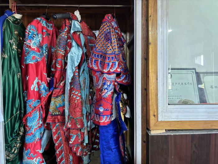 "這些小馬燈不僅是工藝品,更是活著的歷史。"當地民俗專家周國平老人的話語讓團隊成員深受觸動。據介紹,定埠小馬燈表演需28名十二三歲的孩童參與,角色涵蓋三國英雄與岳傳人物,表演陣法包括"一字長蛇陣""二腳陣"等,配合歡快的鑼鼓曲牌,展現著濃郁的吳越文化特色。在五猖館,國家級非遺"跳五猖"的傳承更是令人震撼——清代金猖神頭套歷經三百年風雨依然完好,十三身表演服飾上的二十八星宿紋樣,通過蘇繡技藝的一針一線,將陰陽五行的古老智慧代代相傳。