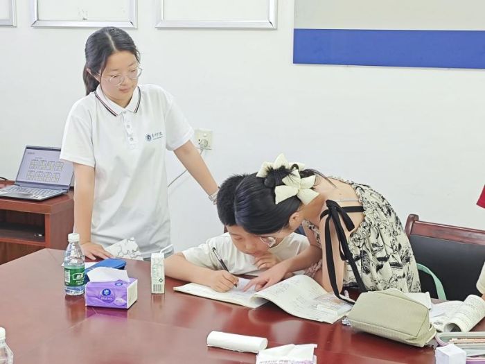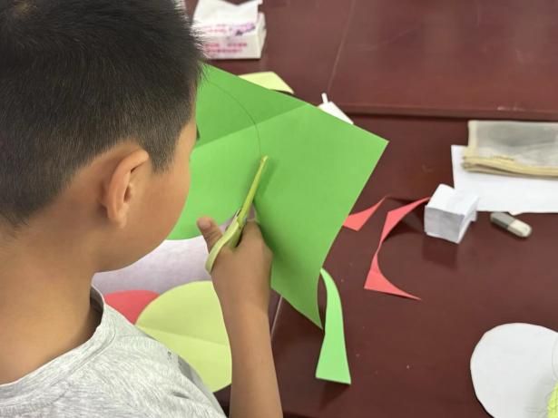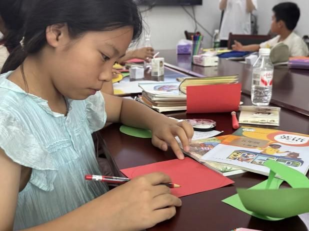 實踐隊員陳雅慧則將"藝術"送到孩子們的指尖。她備好彩色卡紙、亮片、絲帶,以"夏日小扇"為主題手把手教學:"先對折卡紙剪出扇形,再用彩筆繪圖案,最后粘上絲帶當扇柄。"孩子們有的畫綻放的荷花,有的貼星星貼紙,有的用亮片拼"黎明"二字。30把形態各異的小扇子在課桌上鋪展開,宛如一片色彩斑斕的"扇海"。"我的扇子要送給奶奶,她夏天總給我扇風。"一位八歲小朋友舉著畫西瓜的扇子說。陳雅慧輕輕摸了摸他的頭:"你們的想象力,就是最珍貴的藝術。"這些瞬間不僅是知識的收獲,更讓實踐團看到了教育最本真的溫度——它不僅是單向的傳授,更是情感的聯結與心靈的喚醒。