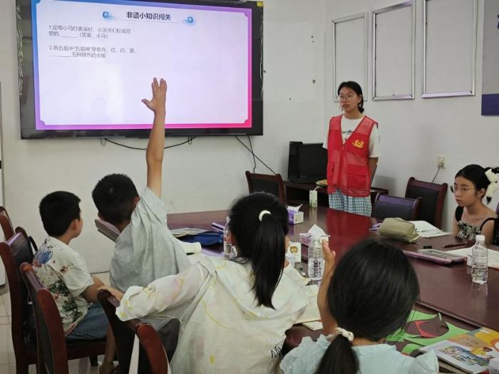 7月4日下午,"郎溪故事"課堂上,實踐隊員李艷通過精心制作的PPT,帶孩子們"云游"家鄉:從風光秀美的石佛山、龍須湖,到歷史悠久的建平鎮古街;從"中國綠茶之鄉"的茶香故事,到非遺"小馬燈"的傳承記憶,課堂里不時響起孩子們的驚嘆與討論。這堂課的意義,遠不止于知識的傳遞,更在于讓孩子們看見家鄉的美好,進而生出發自內心的認同與驕傲。
