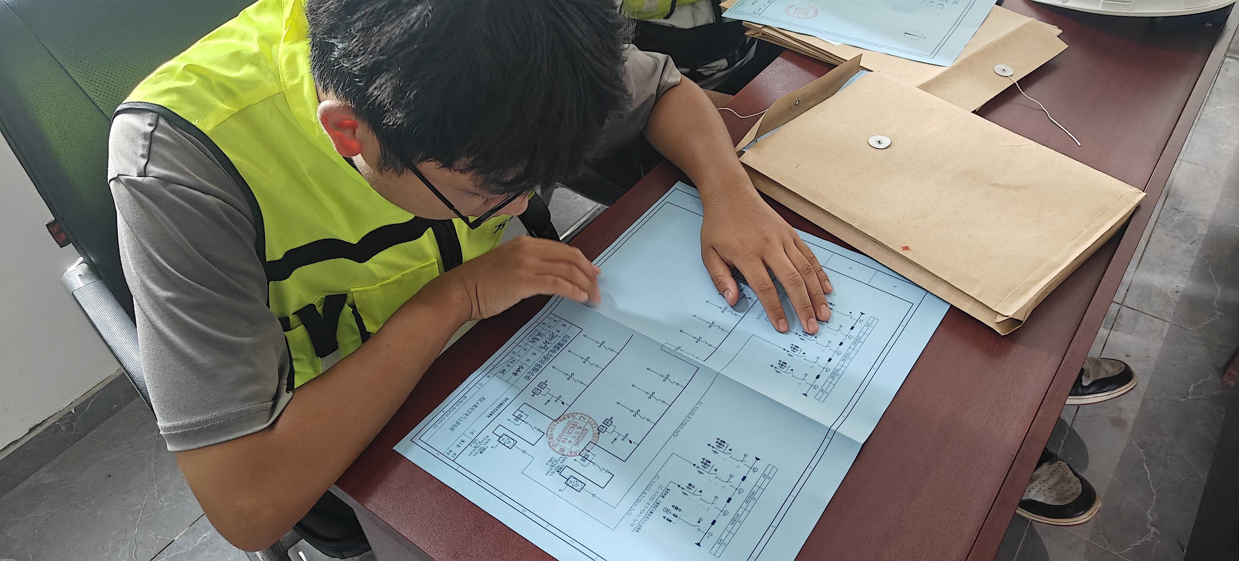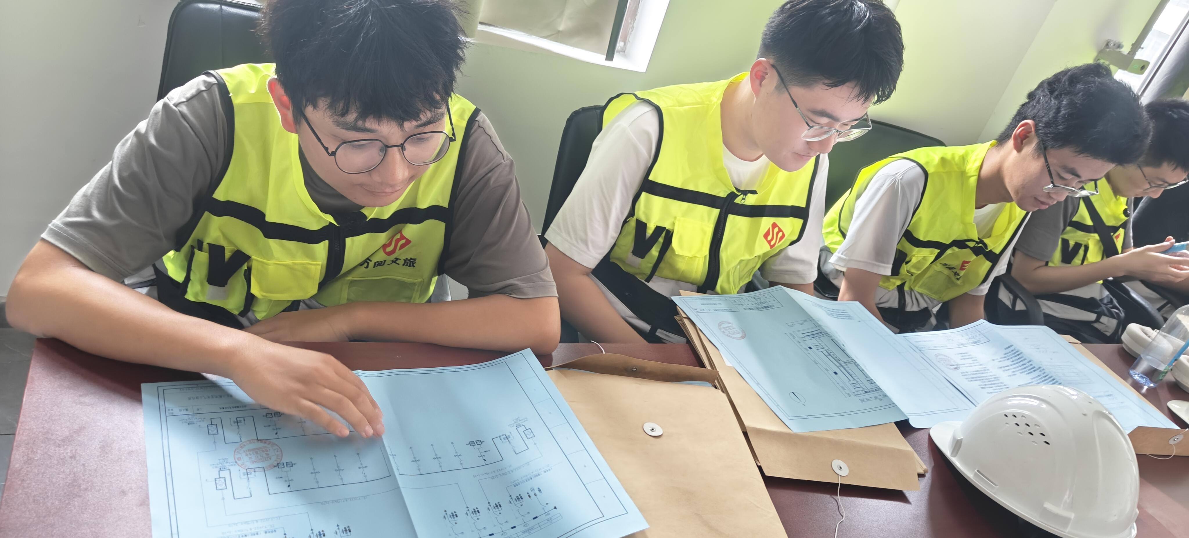 圖紙研析環節,實踐隊成員對照項目配電室平面布置圖、高低壓系統單線圖、二次回路原理圖等技術資料,逐層梳理供電鏈路邏輯與保護配置策略。工程師就圖紙符號釋義、容量核算依據、電纜選型標準等內容進行延伸解讀,引導隊員將理論范式與工程實景相互印證。