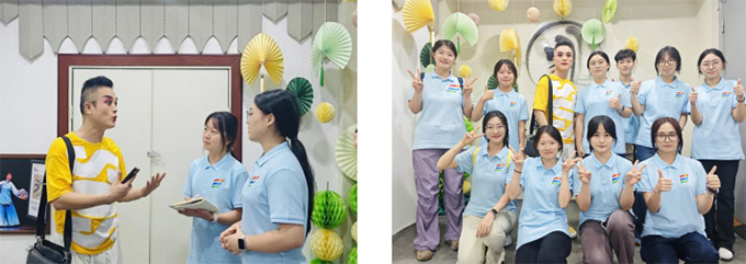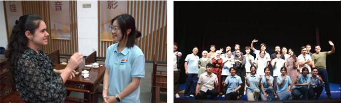 在深入了解復興劇場的歷史與所承載的文化底蘊后,實踐團迎來了一場意想不到的“國際連線”--在歡聲笑語的溝通中架起文化之橋,劇場的熱鬧不止舞臺!實踐團在劇場內遇到來自烏茲別克斯坦的研學學生們,當川劇的鑼鼓聲撞上異國青年的好奇目光,一場“此時無聲勝有聲”的文化對話悄然開啟。