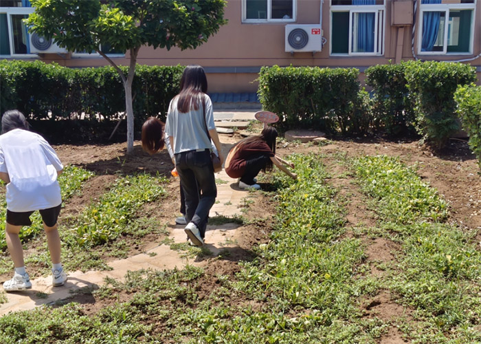 養老院后院的菜園里,成員們和護工一起摘菜。82歲的王爺爺搬來小馬扎坐在畦埂邊,指點大家辨認成熟的茄子。“得選這種紫得發亮的,蒂子發綠的還得再長幾天。”他邊說邊彎腰示范,成員們跟著穿梭在菜畦間,摘下的茄子、辣椒很快裝滿了竹籃,沾著泥土的褲腳透著煙火氣。