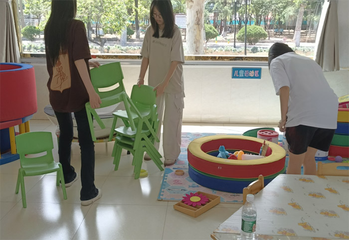 在一間充滿生活氣息的興趣活動室內,陽光透過窗戶輕柔地灑落在地上。社會實踐的成員們正忙碌且有序地整理著各種物品。室內的椅子橫七豎八地擺放著,有的椅腳還相互交錯,像是在訴說著之前活動的熱鬧。還有一些手工制作的半成品,顯得雜亂無章。成員們各自分工明確,有的成員彎下腰,雙手緊緊握住椅子的椅背,小心翼翼地將椅子扶正,然后整齊地排列在墻邊;有的成員則耐心地將散落在地上的道具一件件拾起,仔細分類后放進相應的箱子里。