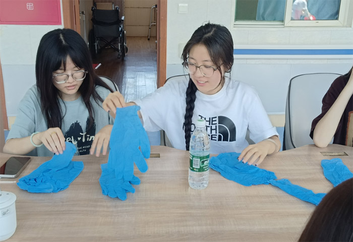 養老院的儲物間里,實踐團成員正和老人們一起整理橡膠手套。78歲的張奶奶戴著老花鏡,將不同尺碼的手套分類捆扎,成員李婷幫她遞過繩子:“奶奶,這包小號的放最上層方便拿。”張奶奶點頭應著,手指在手套上輕輕撫平褶皺,兩人配合著把雜亂的儲物架收拾得整整齊齊。